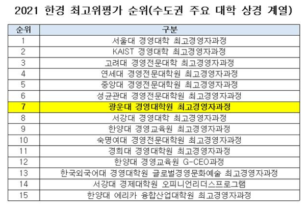 Kwangwoon University Graduate School of Business Advanced Management Program (AMP) ranked 7th in the nation in the “2021 Hankyung Top Ranking” conducted by the Korean Economic Daily. This is a two-step rise from the previous year.