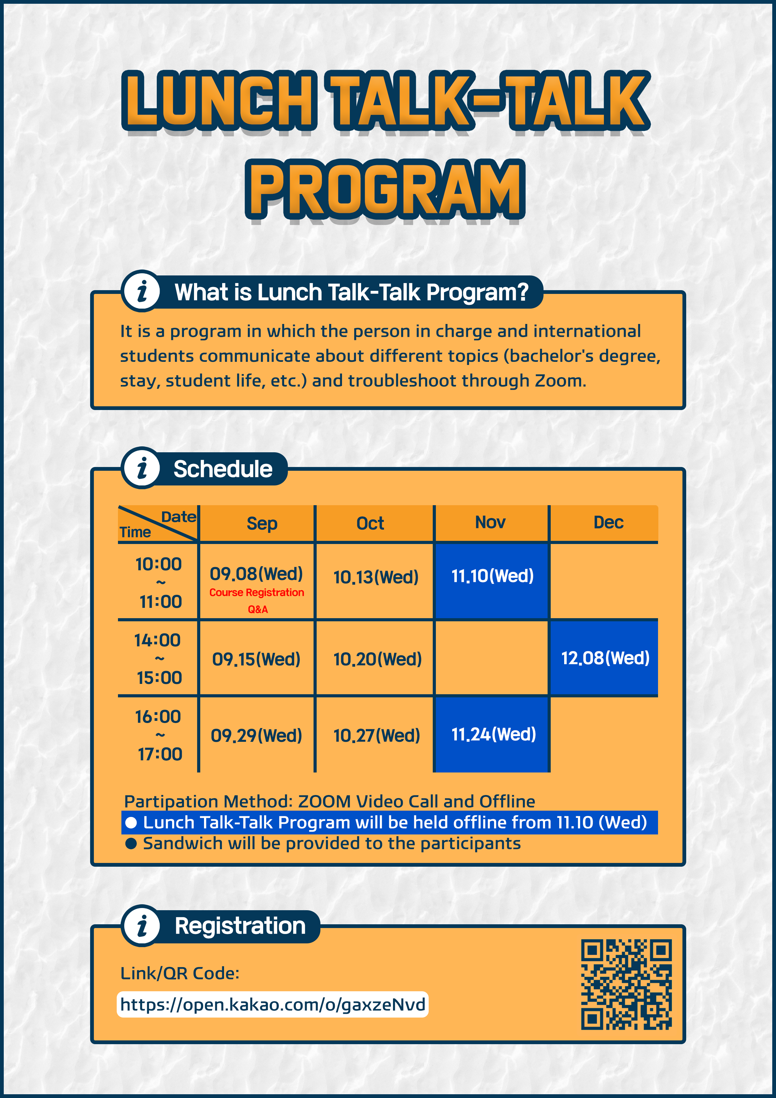Notice List 2021 Fall Lunch Talk-Talk Program Information admin 2021-08-25 7317 Link: https://open.kakao.com/o/gaxzeNvd List Confirm Password Please enter the password for this post OK